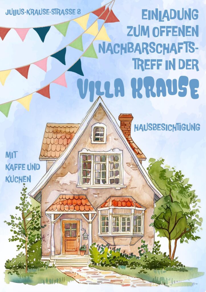 Um 15:00 soll es ein offenes Nachbarschaftstreffen geben für Menschen, die in der Julius-Krause-Straße und Umgebung wohnen. Hier können Wünsche und konkrete Vorstellungen für das neue Projekt gesammelt und die Villa Krause mit einer kleinen Haustour vorgestellt werden.